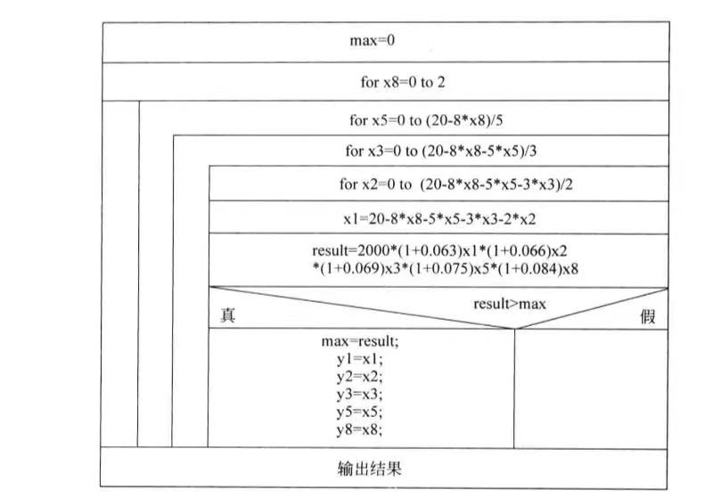 #include<stdio.h> #include<math.h> int main() { int x1,x2,x3,x5,x8,y1,y2,y3,y5,y8; double max=0.0,result; for(x8=0;x8<=2;x8++) for(x5=0;x5<=(20-8*x8)/5;x5++) for(x3=0;x3<=(20-8*x8-5*x5)/3;x3++) for(x2=0;x2<=(20-8*x8-5*x5-3*x3)/2;x2++) { x1=20-8*x8-5*x5-3*x3-2*x2; result=2000.0*pow((1+0.0063*12),x1) *pow((1+2*0.0063*12),x2) *pow((1+3*0.0063*12),x3) *pow((1+5*0.0063*12),x5) *pow((1+8*0.0063*12),x8); if(result>max) { max=result; y1=x1; y2=x2; y3=x3; y5=x5; y8=x8; } } printf("获得利息最多的存款方式为:\n"); printf("8年期限的存了%d次\n",y8); printf("5年期限的存了%d次\n",y5); printf("3年期限的存了%d次\n",y3); printf("2年期限的存了%d次\n",y2); printf("1年期限的存了%d次\n",y1); printf("存款人最终的获得的本利合计:%0.2f\n",result); }
