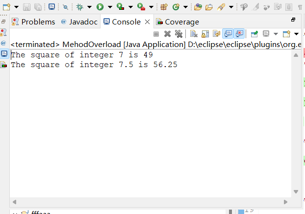 package dongshou1; public class MehodOverload {public static void main(String args[]) { System.out.println("The square of integer 7 is " + square(7)); System.out.println("The square of integer 7.5 is " + square(7.5)); } public static int square(int x) { return x*x; } public static double square(double y) { return y*y; }} |