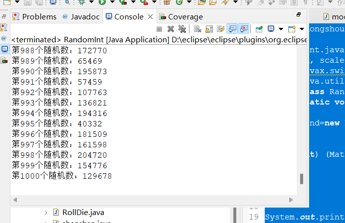 package dongshou1;//RandomInt.java//Shifted, scaled random integersimport javax.swing.JOptionPane;import java.util.*;public class RandomInt {public static void main( String args[] ){Random rand=new Random();int j=2;int m=(int) (Math.pow(2, 18)-1);int a=11;int c=0;System.out.println("请输入产生的随机数的数量:");Scanner input=new Scanner (System.in);int n=input.nextInt();//开辟输入大小的数组;int b[];b=new int[n];System.out.println("请输入随机数的种子:");//输入随机数的种子;b[0]=rand.nextInt(10);System.out.println("第1个随机数: "+b[0]);for(int i=0;i<n-1;i++){b[i+1]=(b[i]*a+c)%m;System.out.print("第"+j+"个随机数:");System.out.println(b[i+1]);j++;}}} |