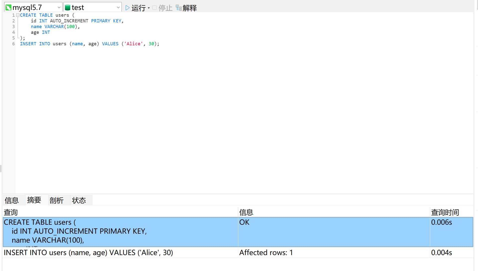 $sql = "INSERT INTO users (name, age) VALUES ('Alice', 30)";