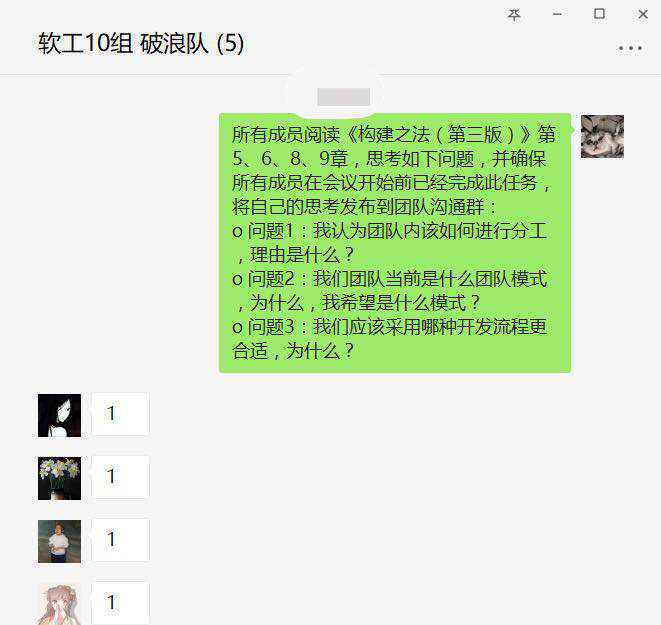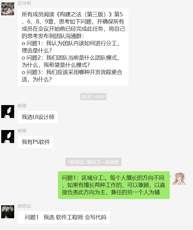 2.通知团队成员阅读《构建之法(第三版)》第5、6、8、9章,思考相应问题及团队成员回复的截图