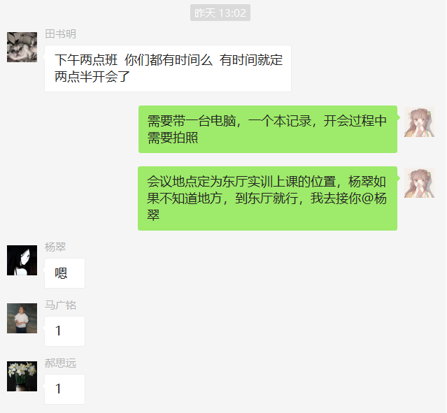 5.通知团队成员开发时间和地点以及会议流程安排及团队成员回复的截图。包括会议计划耗时,以及各个阶段的计划耗时。
