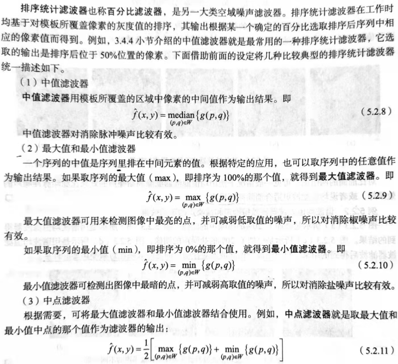 中值滤波器滤除脉冲噪声的效果比滤除高斯噪声的效果好,而其它几种排序统计滤波器对双极性的脉冲噪声的滤波效果并不好