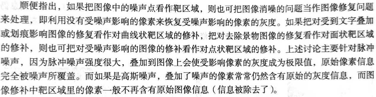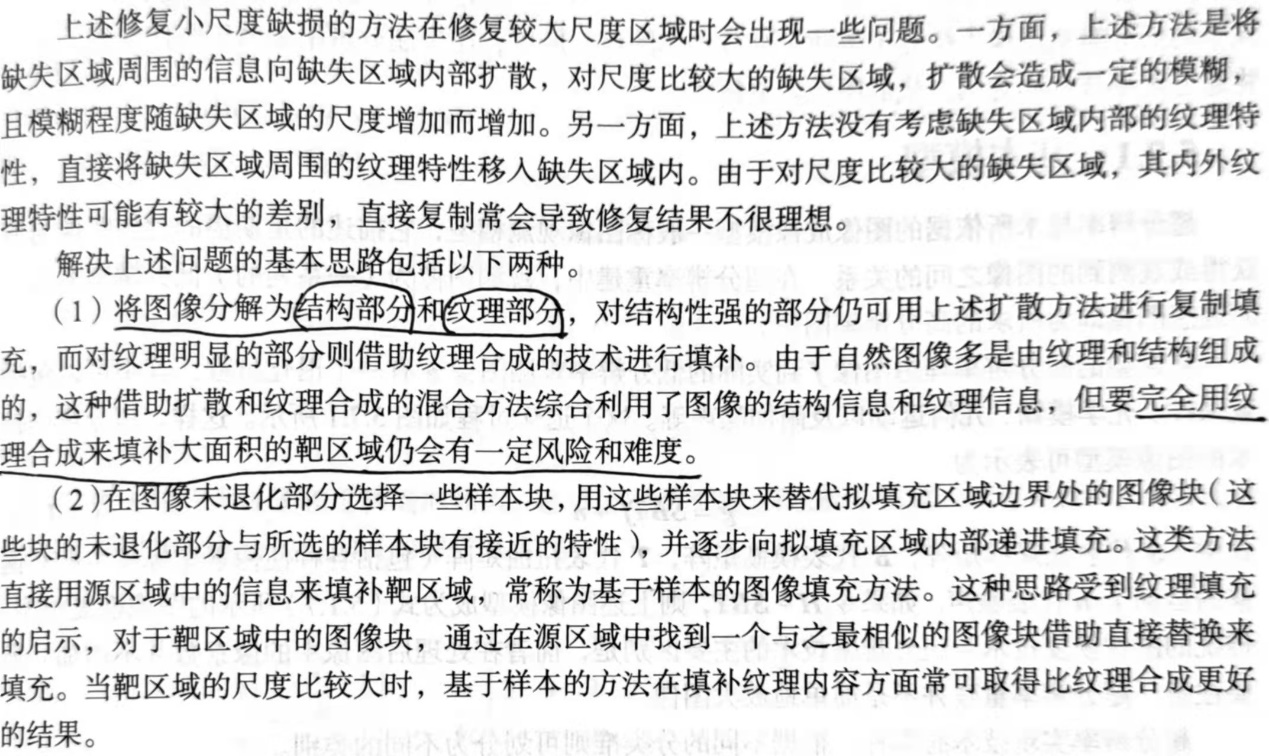 图像缺损尺度较小时,采用的技术主要是利用图像的局部结构信息;尺寸较大时,则常需要全面考虑整幅图像并借助区域的纹理信息。