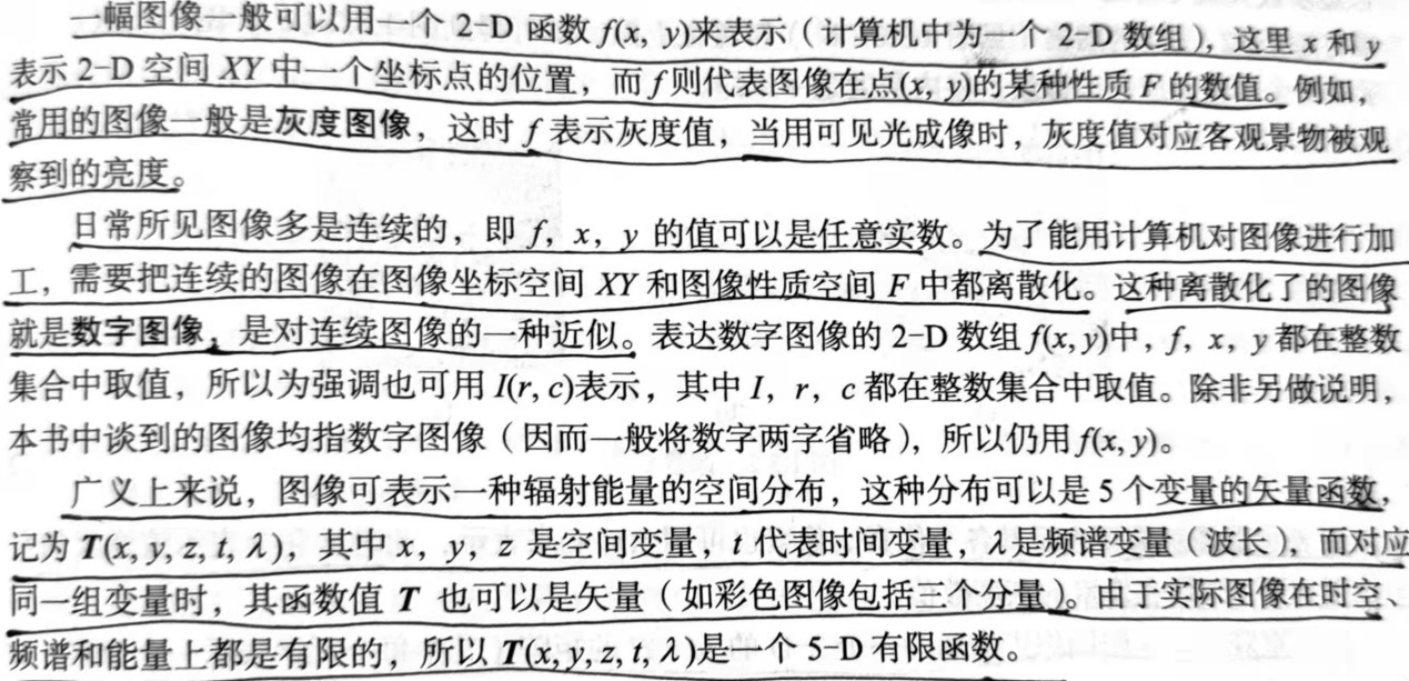 6、3-D图像:坐标空间为三维,需要用三元函数f(x,y,z)来表示的图像,可以看作一系列2-D图像叠加而成。视频图像也可以看作3-D图像,用f(x,y,t)表示