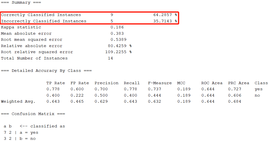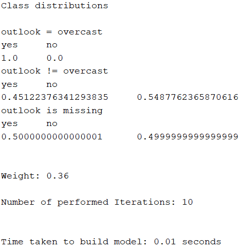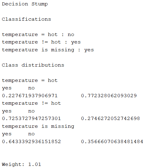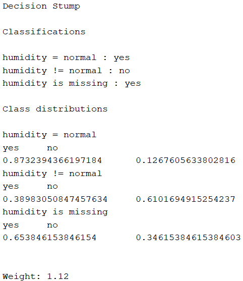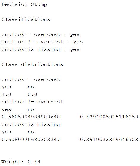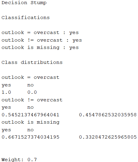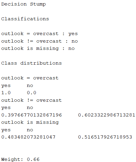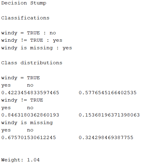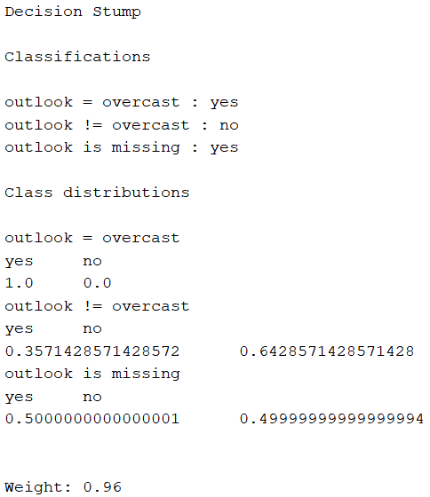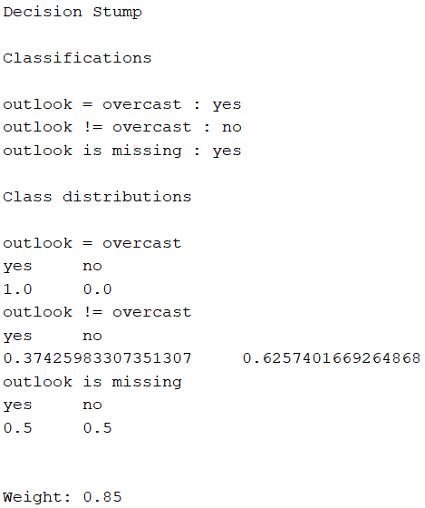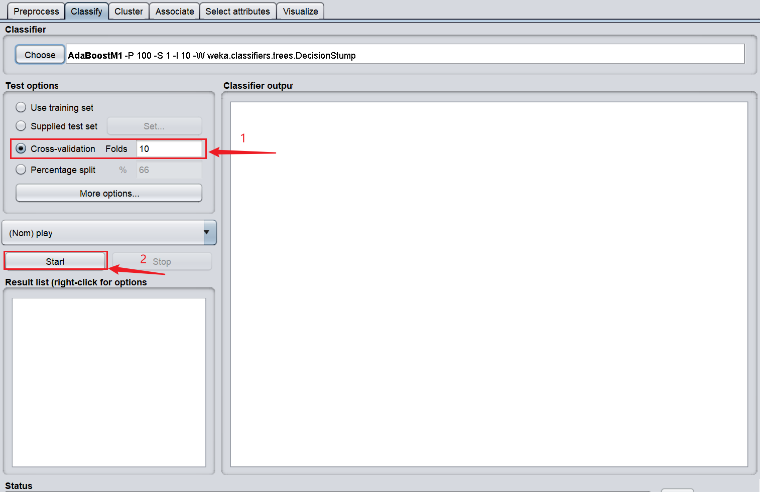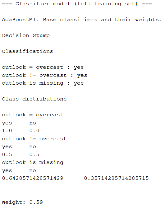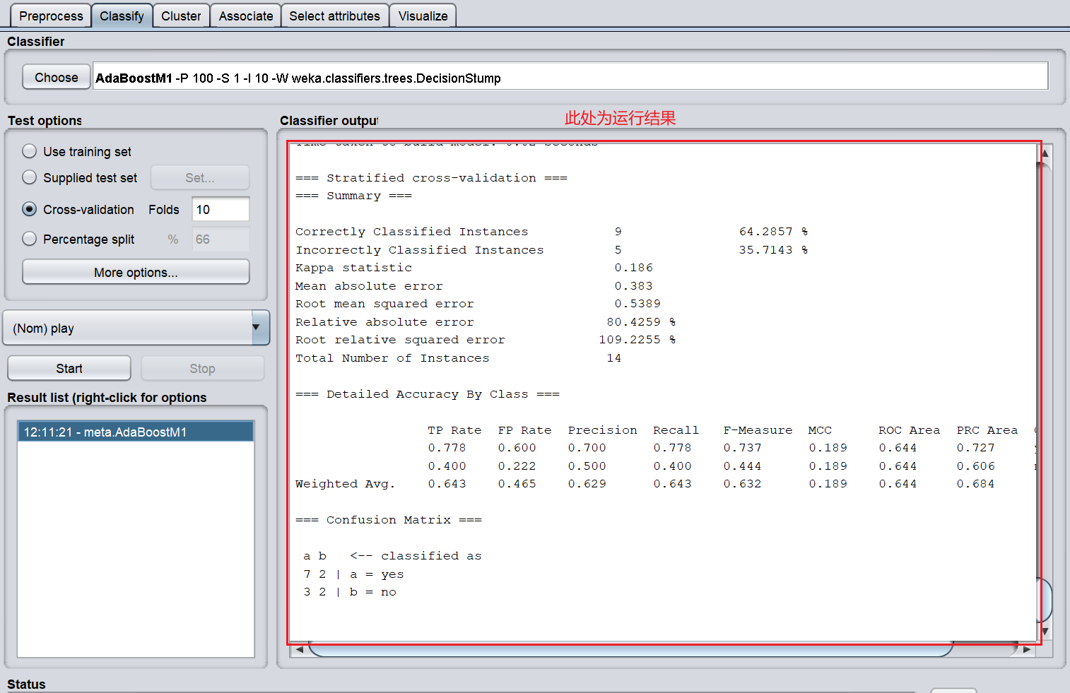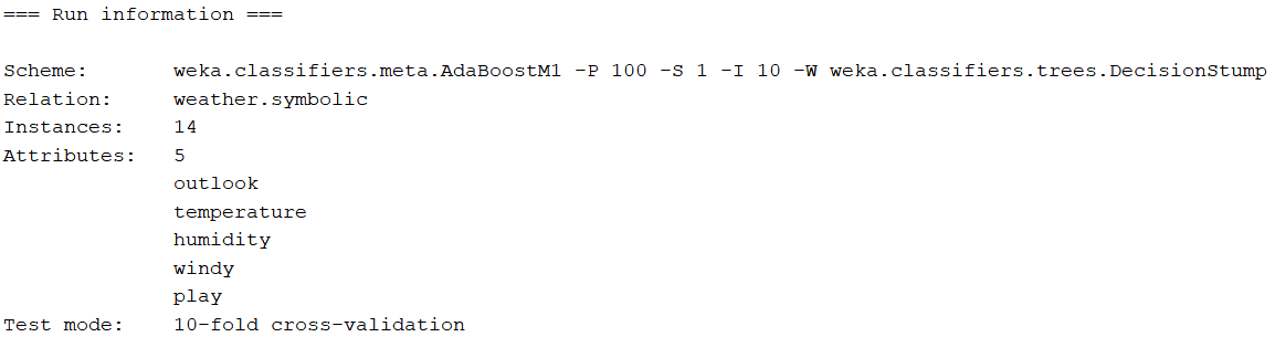 如下运用weka中的AdaBoost分类器对weather.nominal.arff数据集进行十折交叉验证