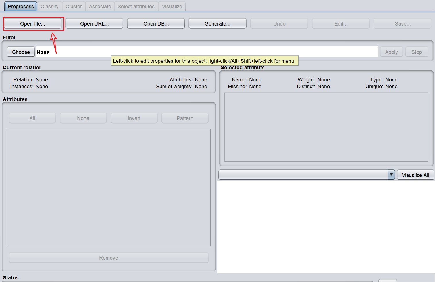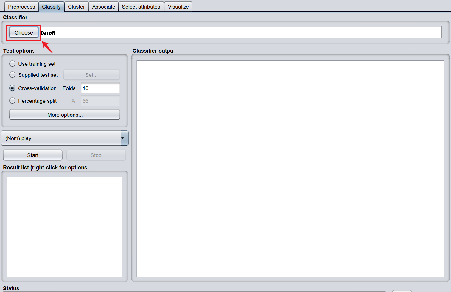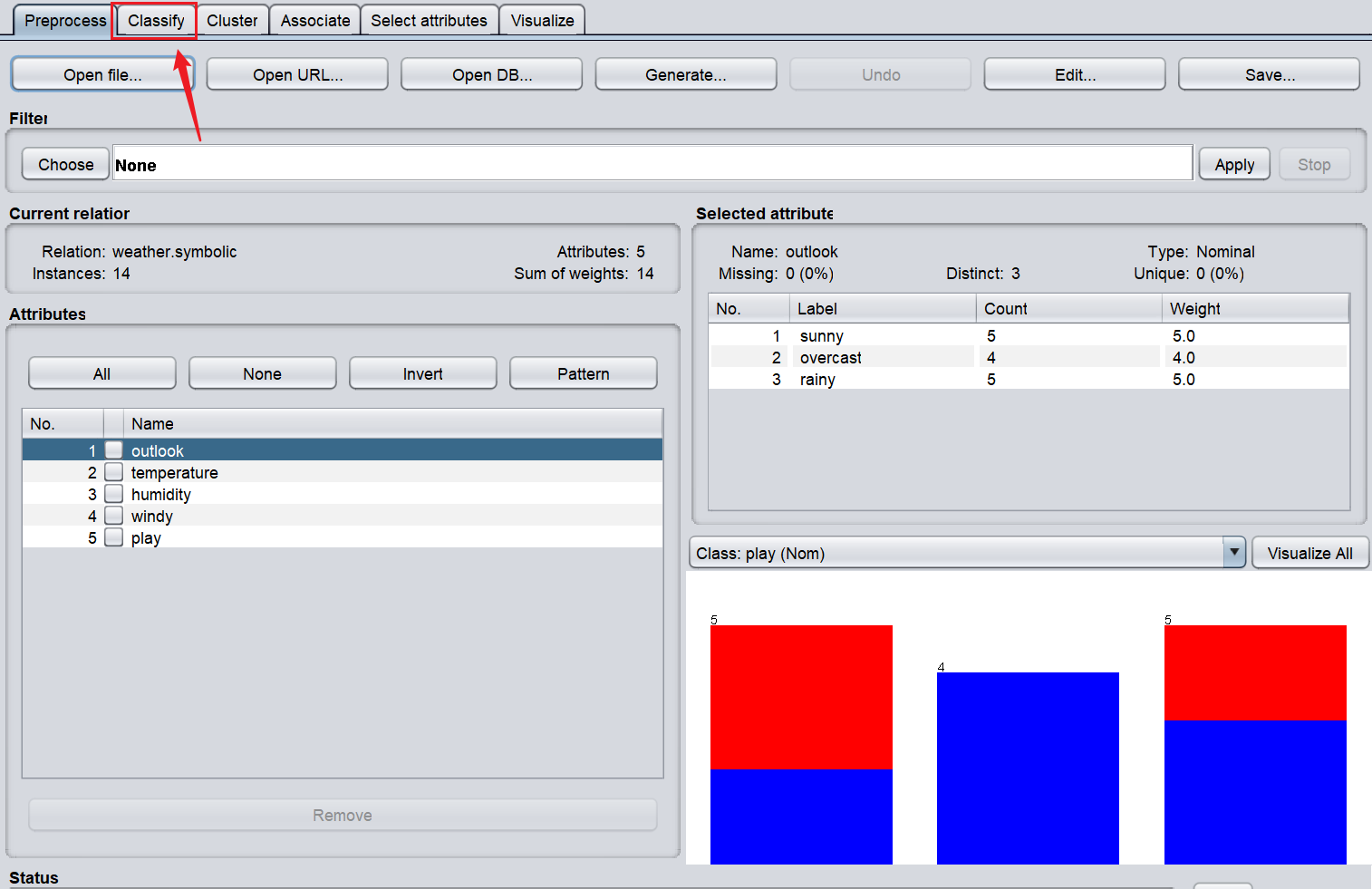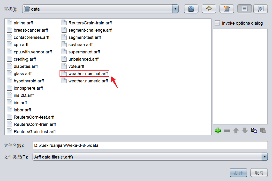 (4)这里以weather.nominal.arff数据集为例,选择打开