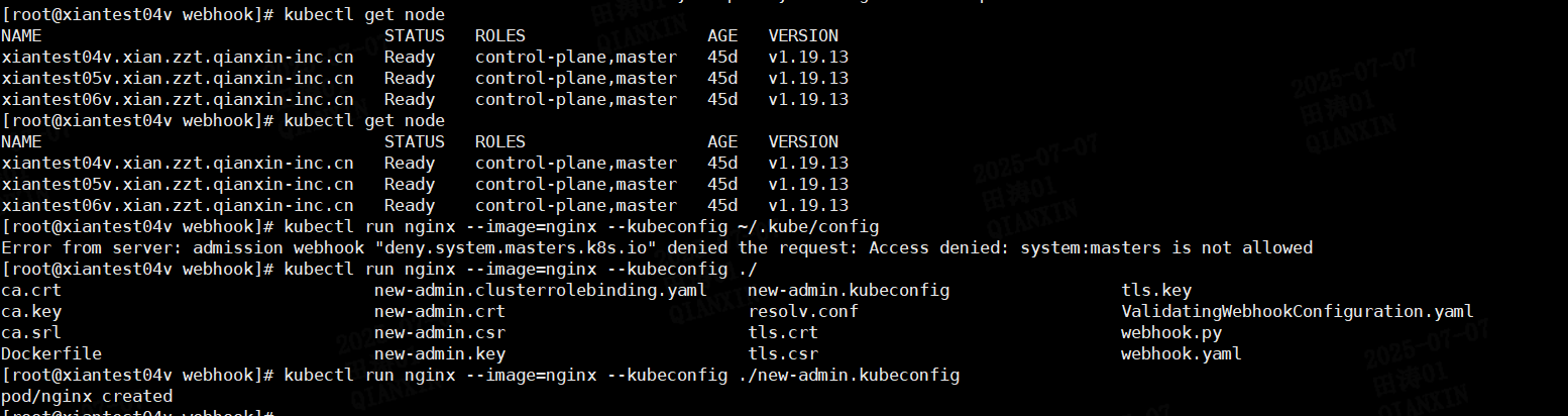 以下是完整的 Kubernetes Admission Webhook 实现方案,用于长期拦截 **所有 namespace 中 system\:masters 组(/O=system\:masters)发起的所有资源操作请求**,防止使用该组访问敏感资源。此方案支持部署到生产环境,具有可维护性和可扩展性。