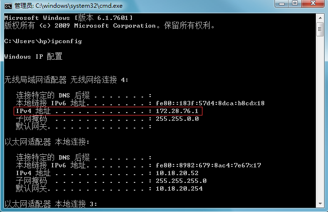 1、确保手机和fiddler所在主机在同一个局域网中(台式机可以加个无线网卡试试),获取fiddler所在主机的ip地址,通过cmd命令ipconfig,找到对应的IPv4地址