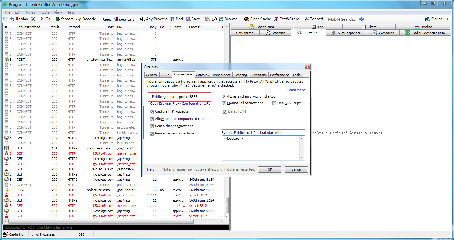 2、打开fiddler,菜单栏Tools - Options - Connections 中Allow remote computers to connect等选项勾上,勾选后保存并重启Fiddler。