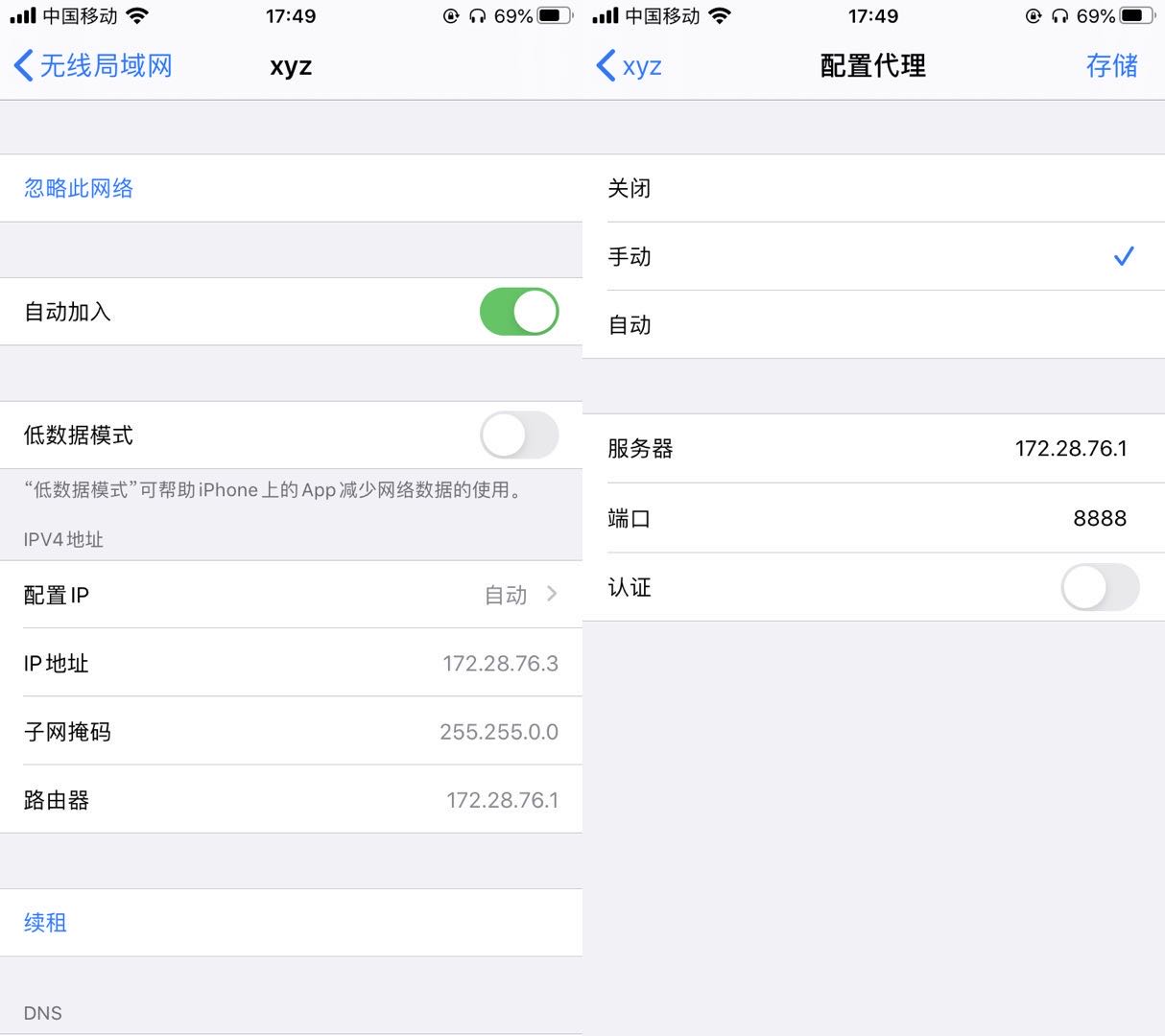3、对手机所连接的无线网络进行设置,ios系统(安卓同理)点击设置-无线局域网,点击Fiddler所在主机在同一个局域网的wifi,连接上点击感叹号,选择配置代理,选择手动,输入上面的ip地址和端口(8888,fiddler默认,可以在fiddler里修改)后保存。