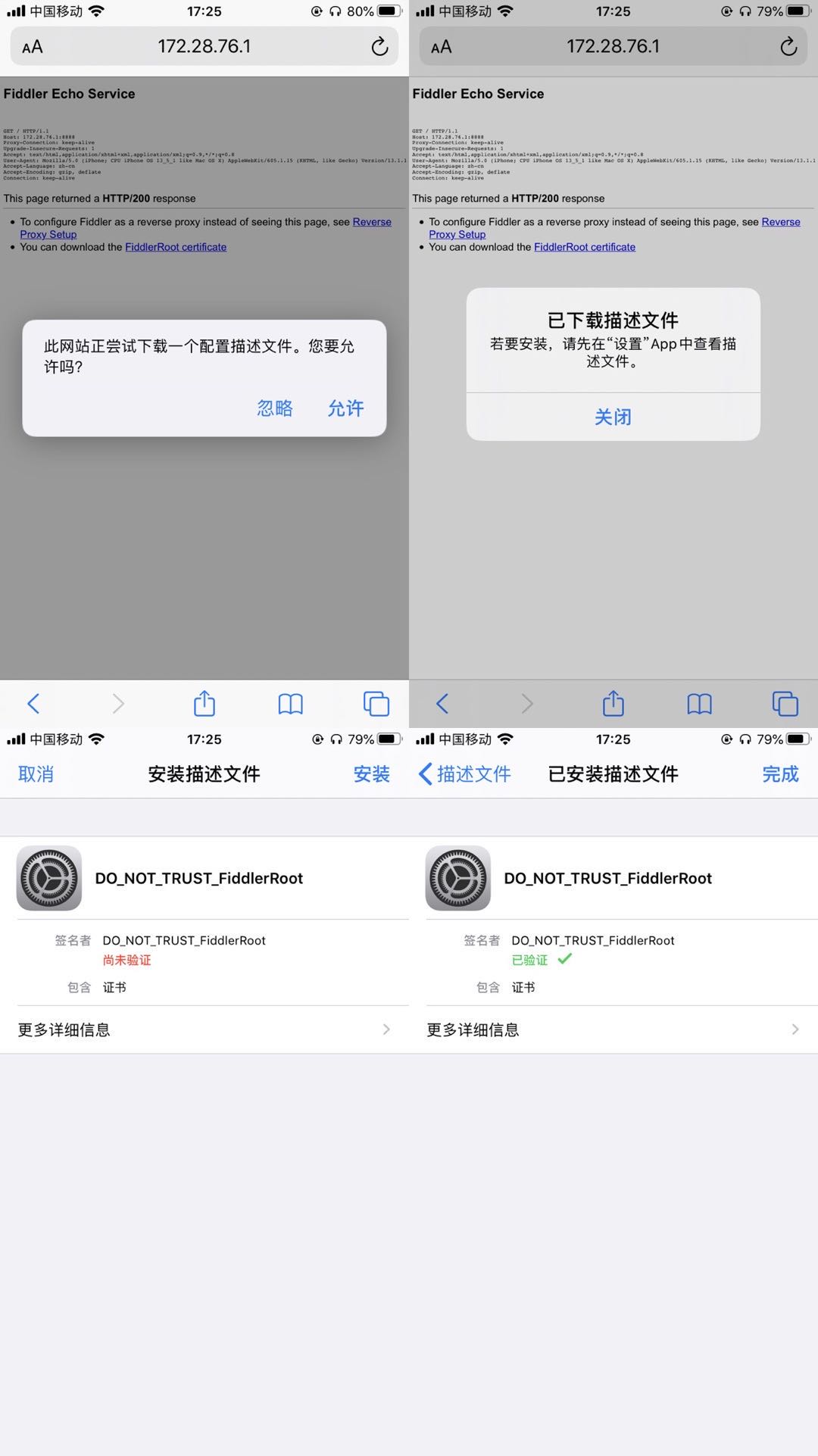 4、在手机浏览器上输入:http://IP地址:端口(例172.28.76.1:8888),点击FiddlerRoot certificate下载安装Fiddler证书