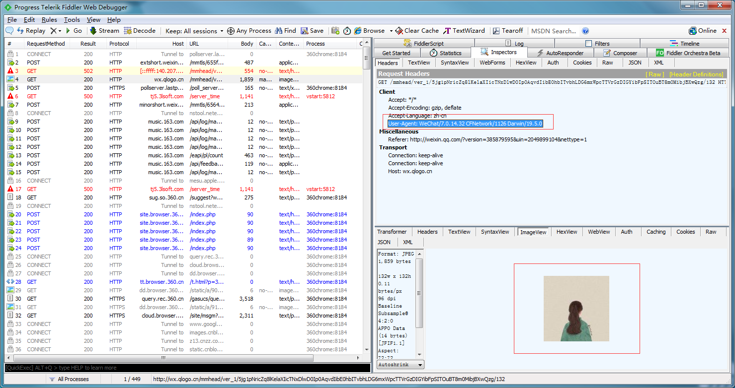 5、以上配置完成,fiddler已经可以接收手机数据,根据相关筛选项筛选查看数据