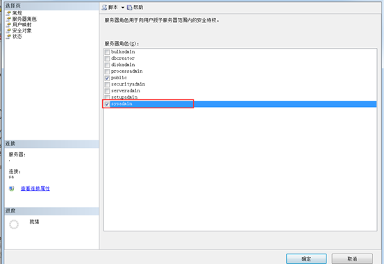2.为登录名赋予服务器角色权限,其中dbcreator权限表示允许新增和修改权限,sysadmin权限是管理员权限,包含dbcreator范围,若不追求权限精准管理的话可用sysadmin