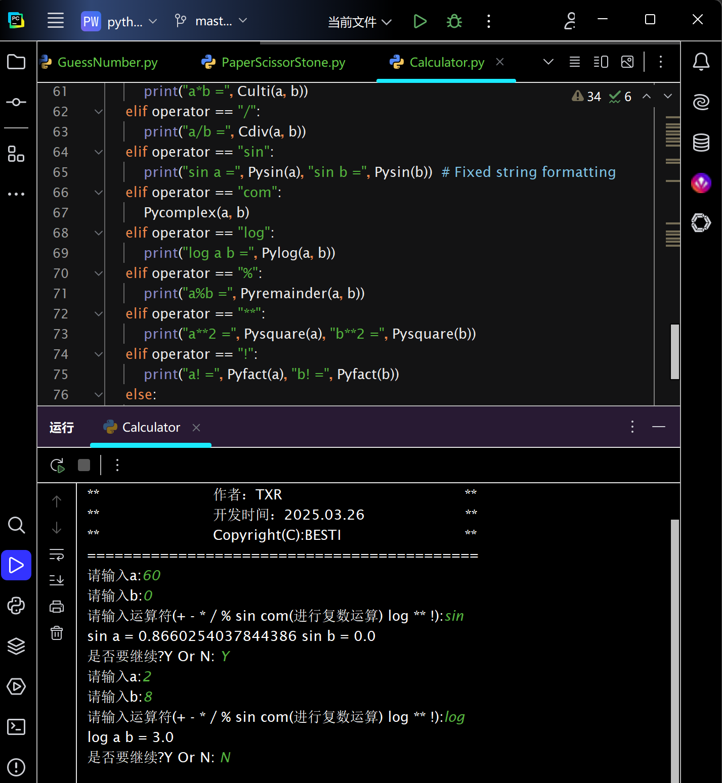 根据实验的要求,先用函数定义好计算器的sin三角函数、加、减、乘、除、复数、对数、模、乘方与阶乘运算,同时得考虑到除法运算中除数为零的情况。