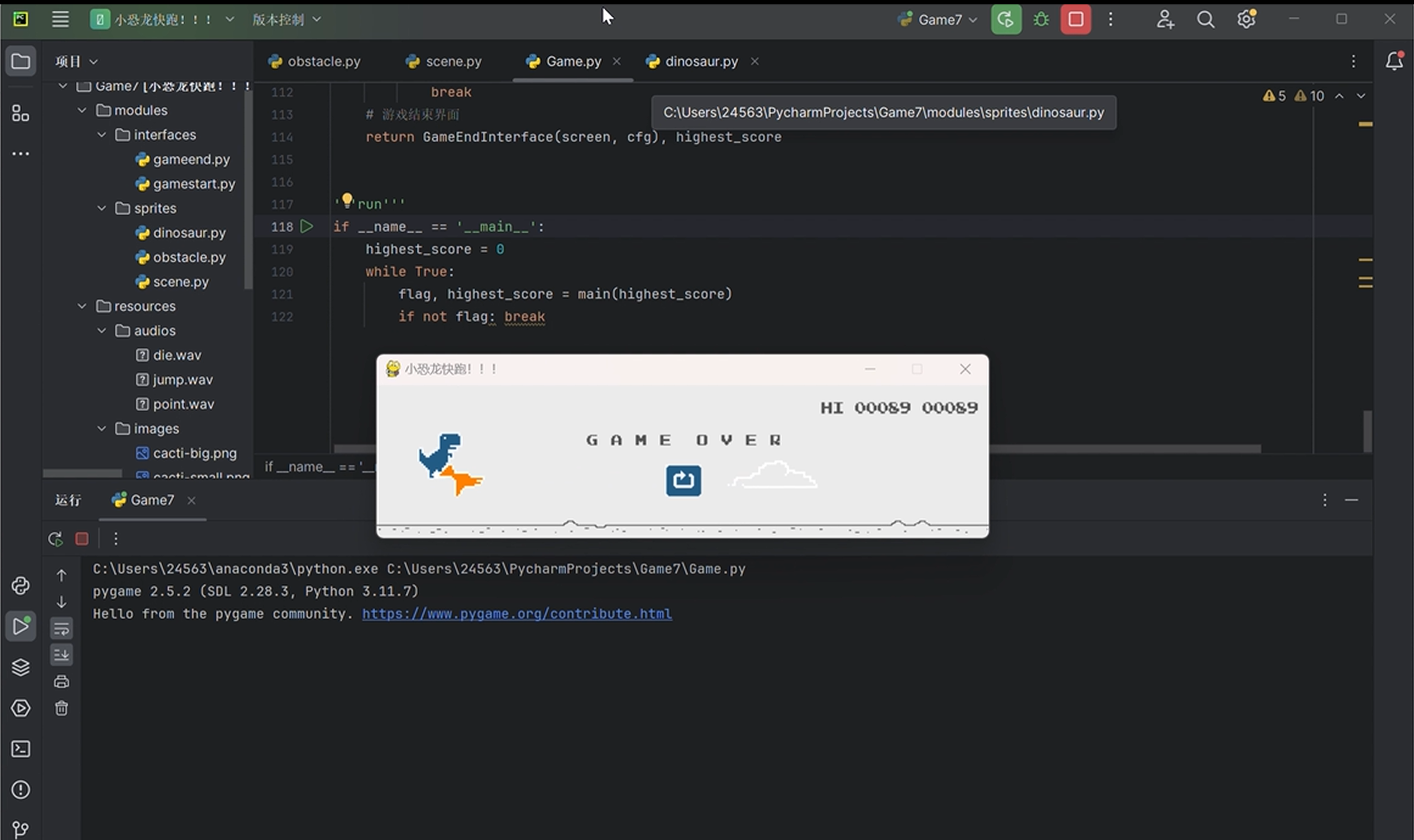 想要用Pycharm项目来实现一个小恐龙跑酷游戏,里面包括游戏初始化、事件处理、游戏元素的更新和绘制、碰撞检测等。玩家可以通过↑键来控制小恐龙躲避障碍物,不断奔跑并尽量获得更高的分数。(由于才疏学浅,游戏中的图片元素不是本人绘制)