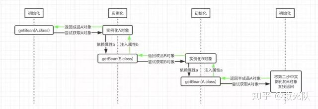 ①首先Spring尝试通过ApplicationContext.getBean()方法获取A对象的实例,由于Spring容器中还没有A对象实例,因而其会创建一个A对象