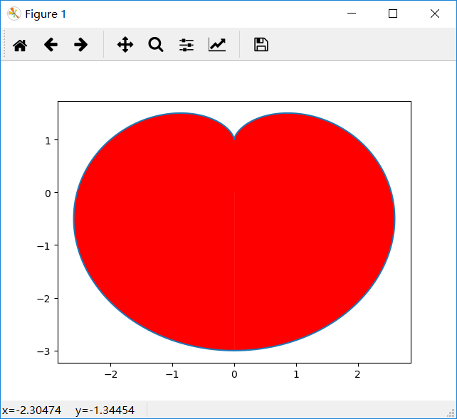 1 import matplotlib.pyplot as plt 2 import numpy as np 3 4 #初始化数据 5 init = np.arange(-np.pi, np.pi, 0.001) 6 y = np.subtract(np.multiply(2, np.cos(init)), np.cos(np.multiply(2, init))) 7 x = np.subtract(np.multiply(2, np.sin(init)), np.sin(np.multiply(2, init))) 8 9 #画图 10 plt.plot(x, y) 11 plt.fill_between(x, y, facecolor='red') 12 plt.show()