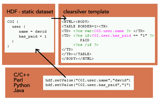 Clearsilver的两个基本概念为数据和Clearsilver(CS)模板。模板由html语句和CS语句构成,控制着数据的表现形式。通过使用Clearsilver,可以强制数据和表现分离,有利于后台数据人员和前台数据人员各司其职协同工作,不用修改后台逻辑就可以完成页面的重构。