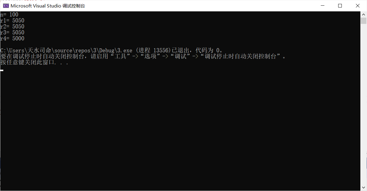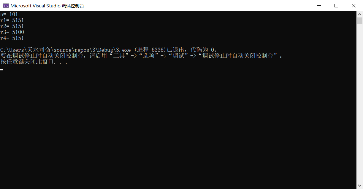 #include<stdio.h> int main() { int n, r1, r2, r3, r4; n = 101; r1 = n * (n + 1) / 2; r2 = (n + 1) * n / 2; r3 = n / 2 * (n + 1); r4 = (n + 1) / 2 * n; printf("n= %d\n", n); printf("r1= %d\n", r1); printf("r2= %d\n", r2); printf("r3= %d\n", r3); printf("r4= %d\n", r4); return 0; }