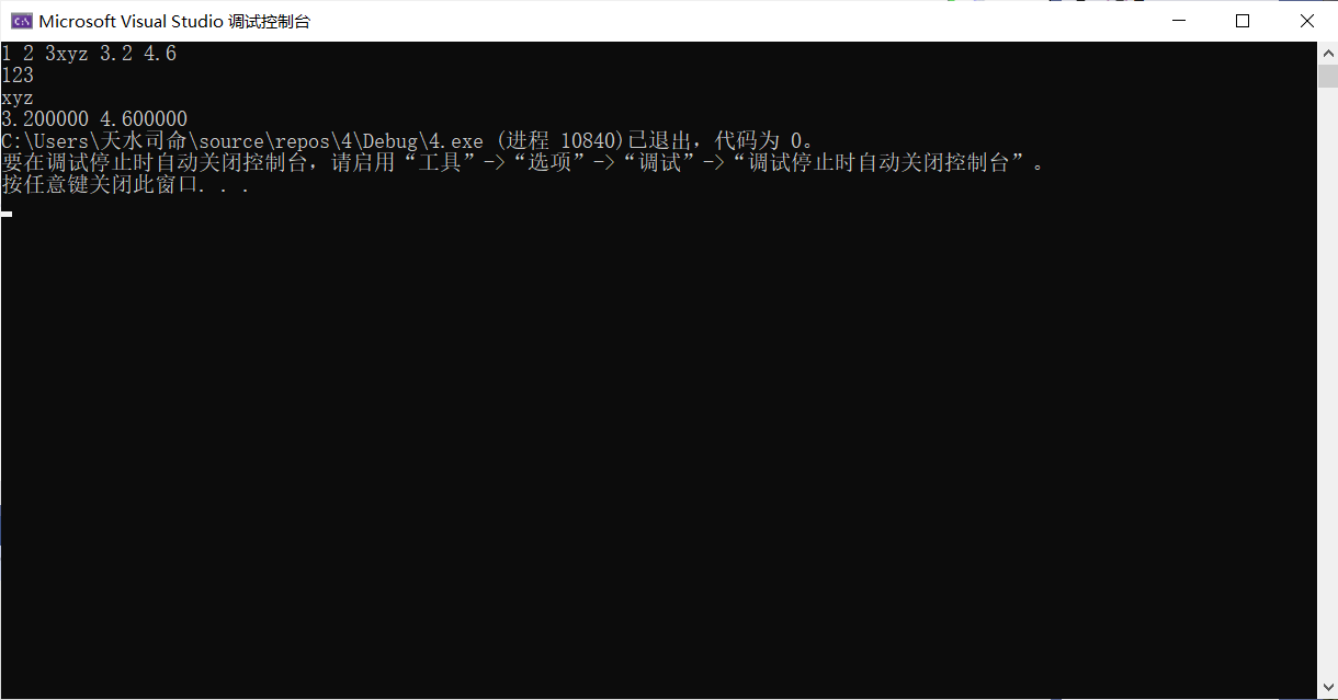 #include<stdio.h> # pragma warning (disable:4996) int main(){ double x,y ; char c1,c2, c3; int a1, a2, a3; scanf("%d%d%d",&a1,&a2,&a3); printf("%d%d%d\n", a1, a2, a3); scanf("%c%c%c", &c1, &c2, &c3); printf("%c%c%c\n", c1, c2, c3); scanf("%lf%lf", &x, &y); printf("%lf %1f", x, y); return 0; }