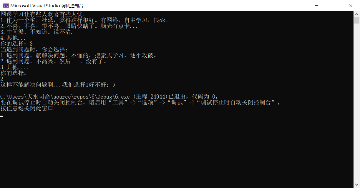 #include<stdio.h> int main() { int answer; char words[5000]; printf("网课学习让有些人欢喜有些人忧.\n"); printf("1.作为一个宅,社恐,觉得这样很好。有网络,自主学习,很ok。\n"); printf("2.不喜,不喜,很不喜。眼睛快瞎了。脑壳有点卡...\n"); printf("3.中间派。不知道。说不清.\n"); printf("4.其他...\n"); printf("你的选择:"); scanf_s("%d", &answer); if (answer == 4) { printf("请补充说明你的想法:\n"); getchar(); gets_s(words); } printf("当遇到问题时,你会选择:\n"); printf("1.遇到问题,就解决问题。不懂的,搜索式学习,逐个攻破。\n"); printf("2.遇到问题,不高兴。然后...,没有了。\n"); printf("3.其他....\n"); printf("你的选择:\n"); scanf_s("%d", &answer); if (answer == 1) printf(":)\n"); else if (answer == 2) printf("这样不能解决问题啊...我们选择1好不好:)\n"); else if (answer == 3) { printf("请补充说明你的想法:\n"); getchar(); gets_s(words); } return 0; }