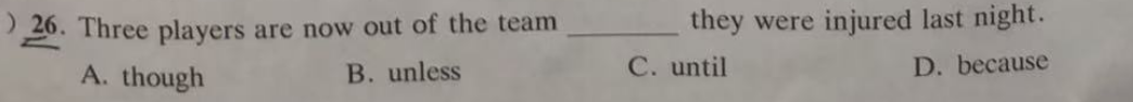 A. though(虽然):表示让步关系,与句意矛盾(受伤应该是退出的原因,而非转折)。
