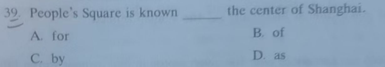 ❌ A. for("be known for" 表示“因……而出名”,强调原因,如:Shanghai is known for its skyline.)