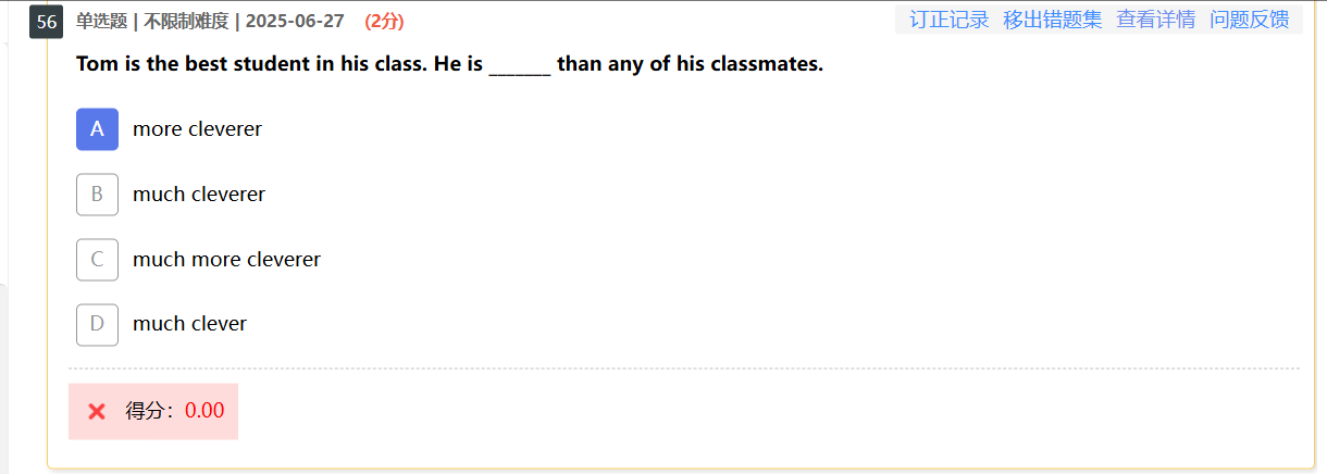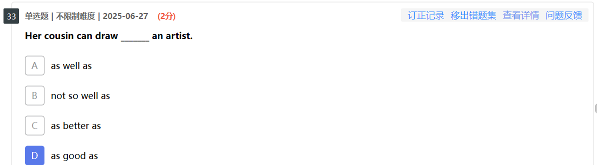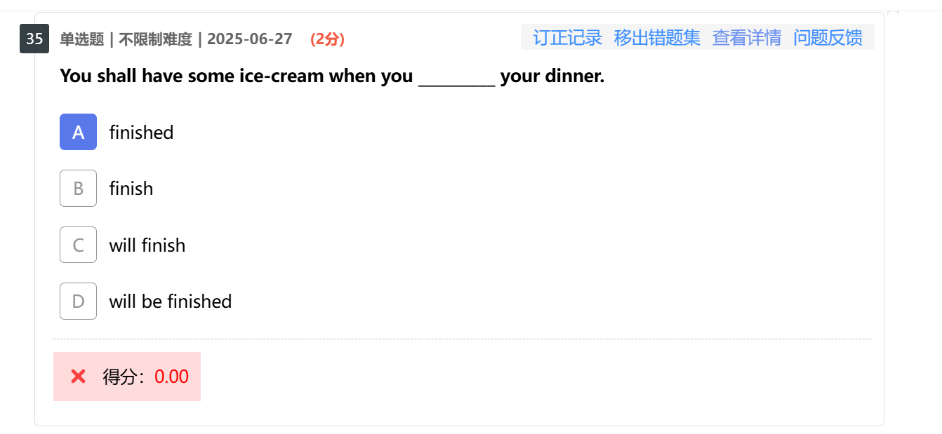 D. /(零冠词):不正确,因为 "come to an end" 是固定搭配,需要冠词。