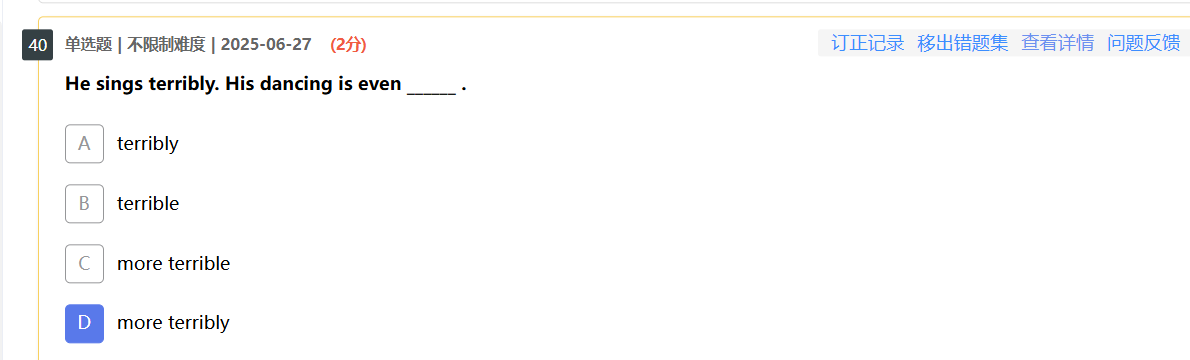 A. sadly(副词,意为“悲伤地”)—— 不正确,因为“sounded”是系动词(linking verb),后面通常接形容词,而不是副词。