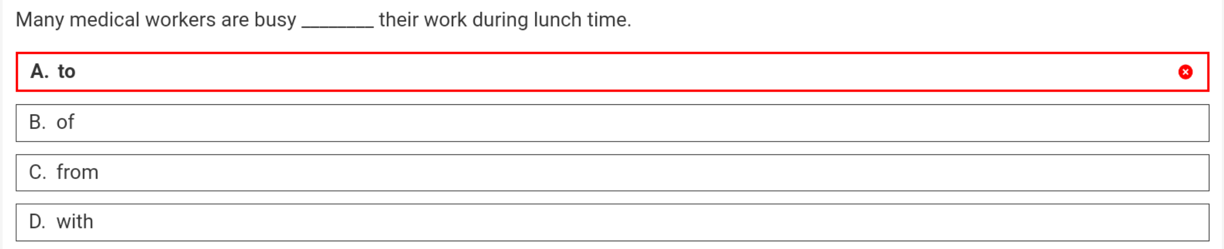 A. to:不搭配"busy",通常用于表示方向或目的(如go to school)。