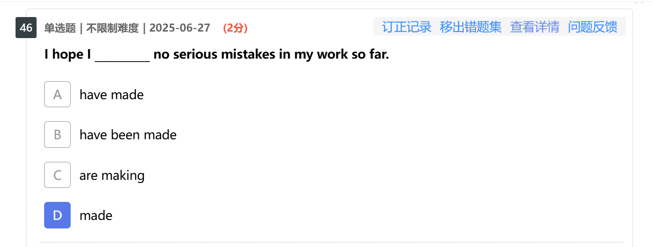 made(一般过去时)→ 不能与"so far"连用,需用完成时