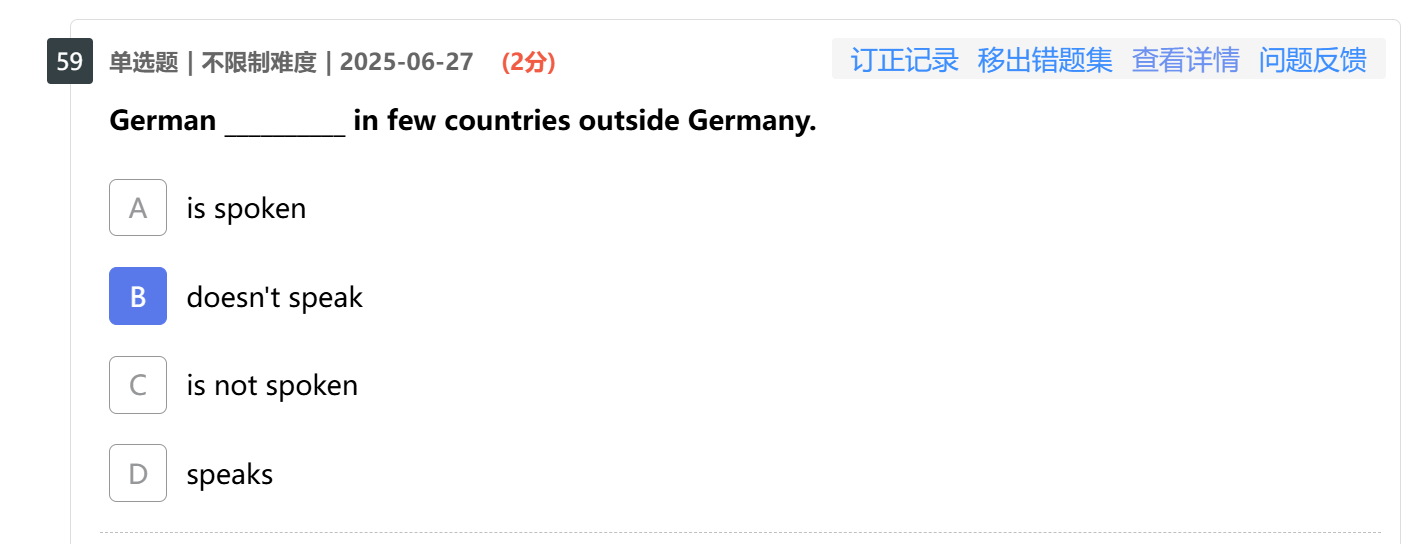 doesn't speak→ 主动语态错误(德语本身不会说话)