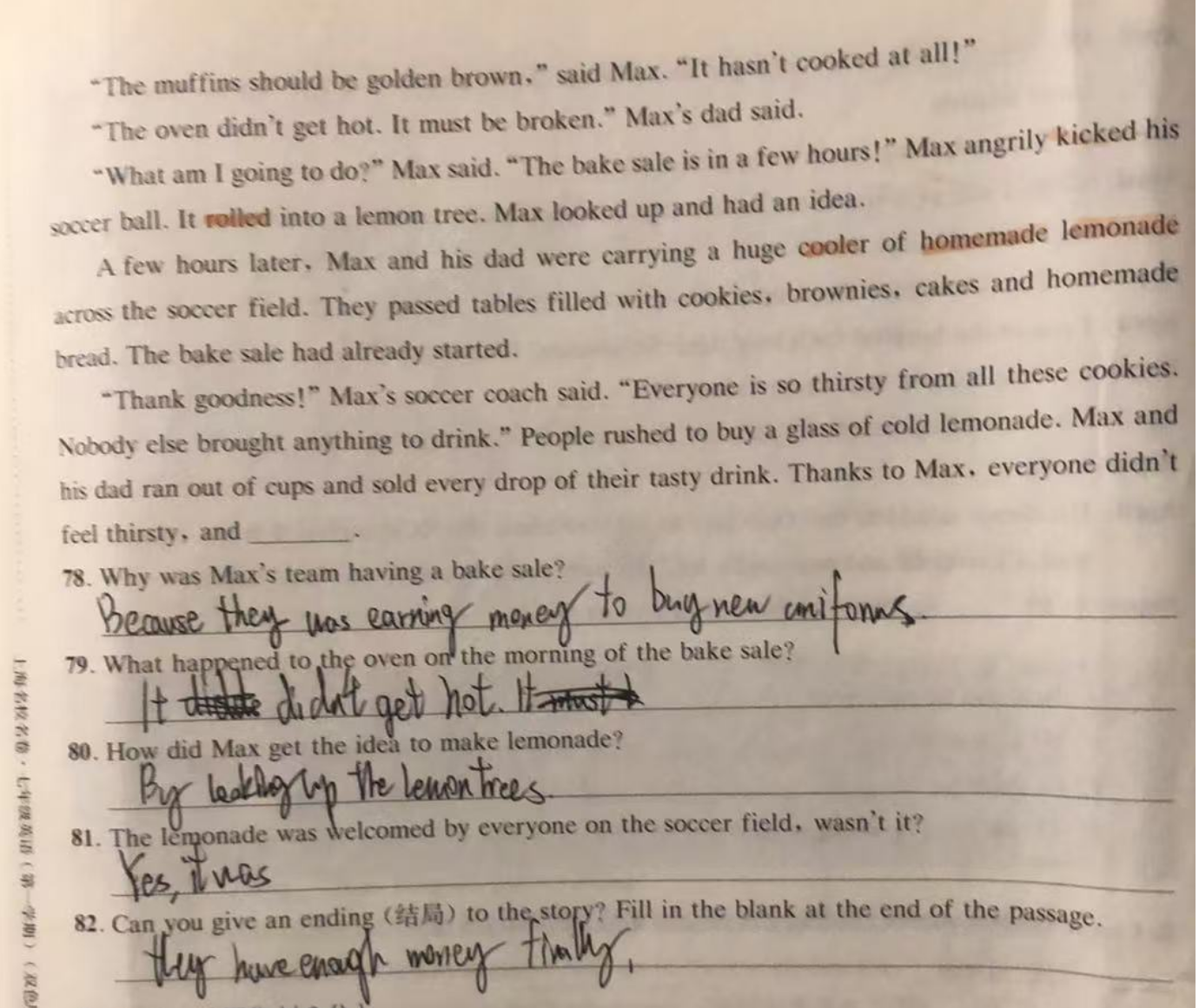 Nobody else brought anything to drink." People rushed to buy a glass of cold lemonade. Max and his dad ran out of cups and sold every drop of their tasty drink. Thanks to Max, everyone didn't feel thirsty. and the team earned enough money to buy their uniform.
