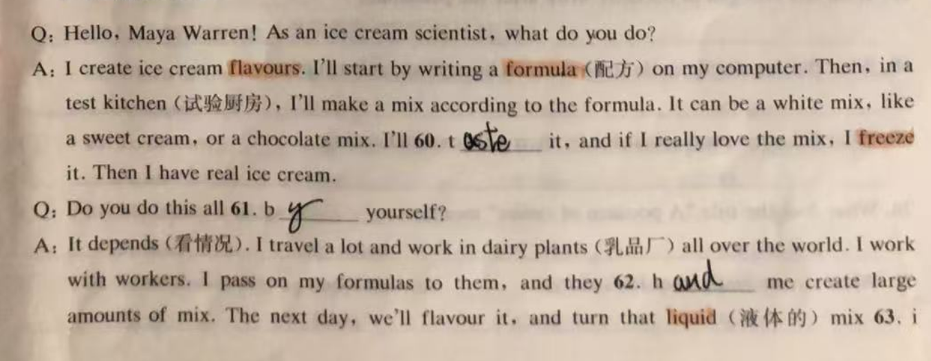 A: I didn't have a plan, but just followed my heart. I chose this job because it makes me truly happy, Creating ice cream flavours is not just a science. It's also an art. There are endless possibilities(无限的可能性)!