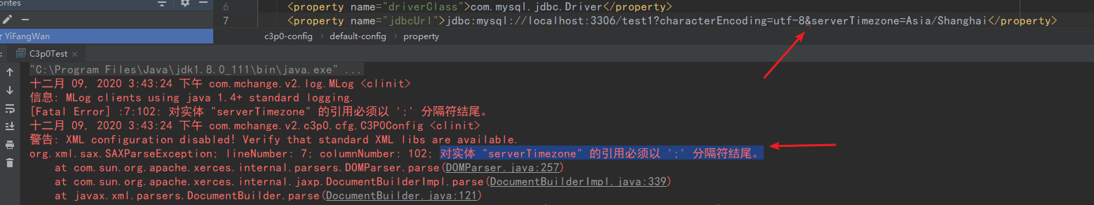 在配置才c3p0-config.xml文件时,向在Mysql连接的url中加入属性,结果报错