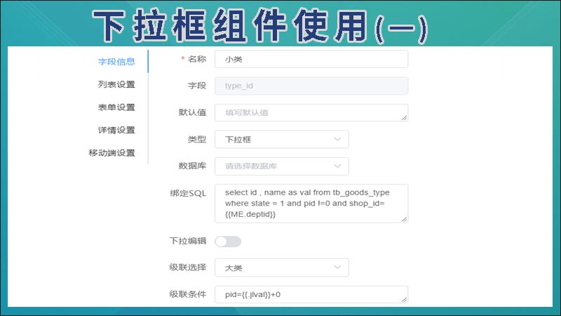 ● 绑定SQL:从分类数据表中选择商品分类表的id和name,并重命名为 id 和 val。