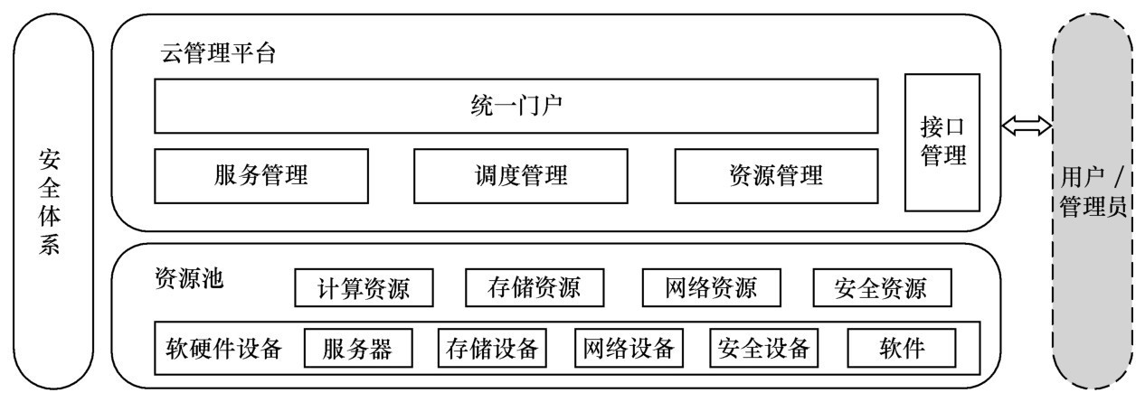 资源池包括计算资源、存储资源、网络资源和安全资源所需的服务器、存储设备、网络设备、安全设备、虚拟化软件和存储软件等相关软硬件设备。云管理平台对资源池的计算资源、存储资源、网络资源和安全资源进行统一管理调度,并为用户提供服务。安全体系通过多维、立体、完善的云安全防御、监控、分析和响应等手段支撑云服务运维运营安全,实现对云安全风险、威胁和攻击的快速发现、快速隔离和快速恢复。