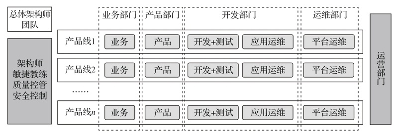 组织中主要困难是跨多个职能团队协作,因此需要一种自上而下的组织模式,能够充分考虑不同团队的痛点,在多个职能团队中推行Dev0ps文化,改进企业交付流程。这种组织以业务线或者应用为中心来组建跨职能团队,打破了传统的部门墙,使得统一业务线上沟通更加便捷,而且团队中各角色目标一致。不同的企业定义的组织不一定相同,图1给出一种组织模型示例。