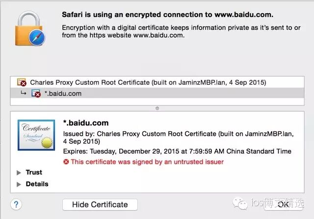 “安装”完成之后,就会将Charles根证书加入系统可信任证书列表中,使用该证书签发的子证书也会被系统信任。Charles会为之前SSL代理设置中配置的域名生成对应的SSL证书,这样伪造证书的证书就实现了欺骗。可以使用Mac SSL代理查看下: