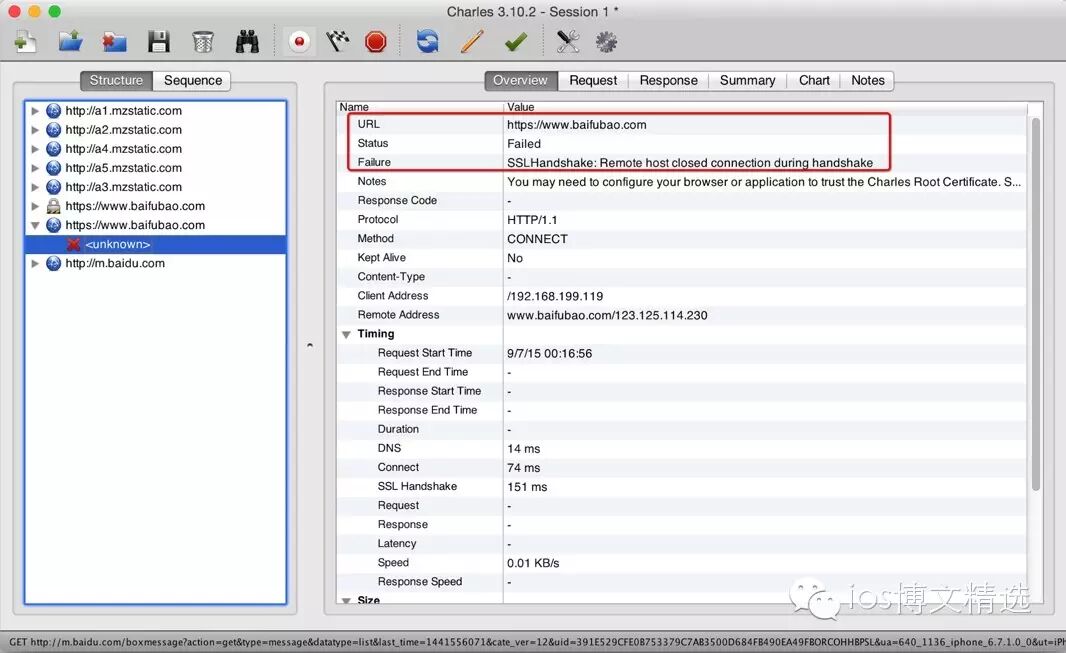 假如你访问的是被代理的目标 URL http://www.baifubao.com 则打不开网页。因为iPhone的HTTPS请求已经被Charles拦截,但iPhone无法信任Charles的证书,所以SSL Handshake失败,无法建立HTTPS连接。