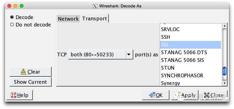 PS:使用Wireshark进行抓包的时候,有时候由于一些HTTPS请求的SSL/TLS版本号太低,Wireshark没办法辨认其是SSL包,而是显示为TCP;此时可以手动来Decode:选择对应的TCP数据帧,右键 -》Decode As -》Transport 选择SSL -》Apply既可。