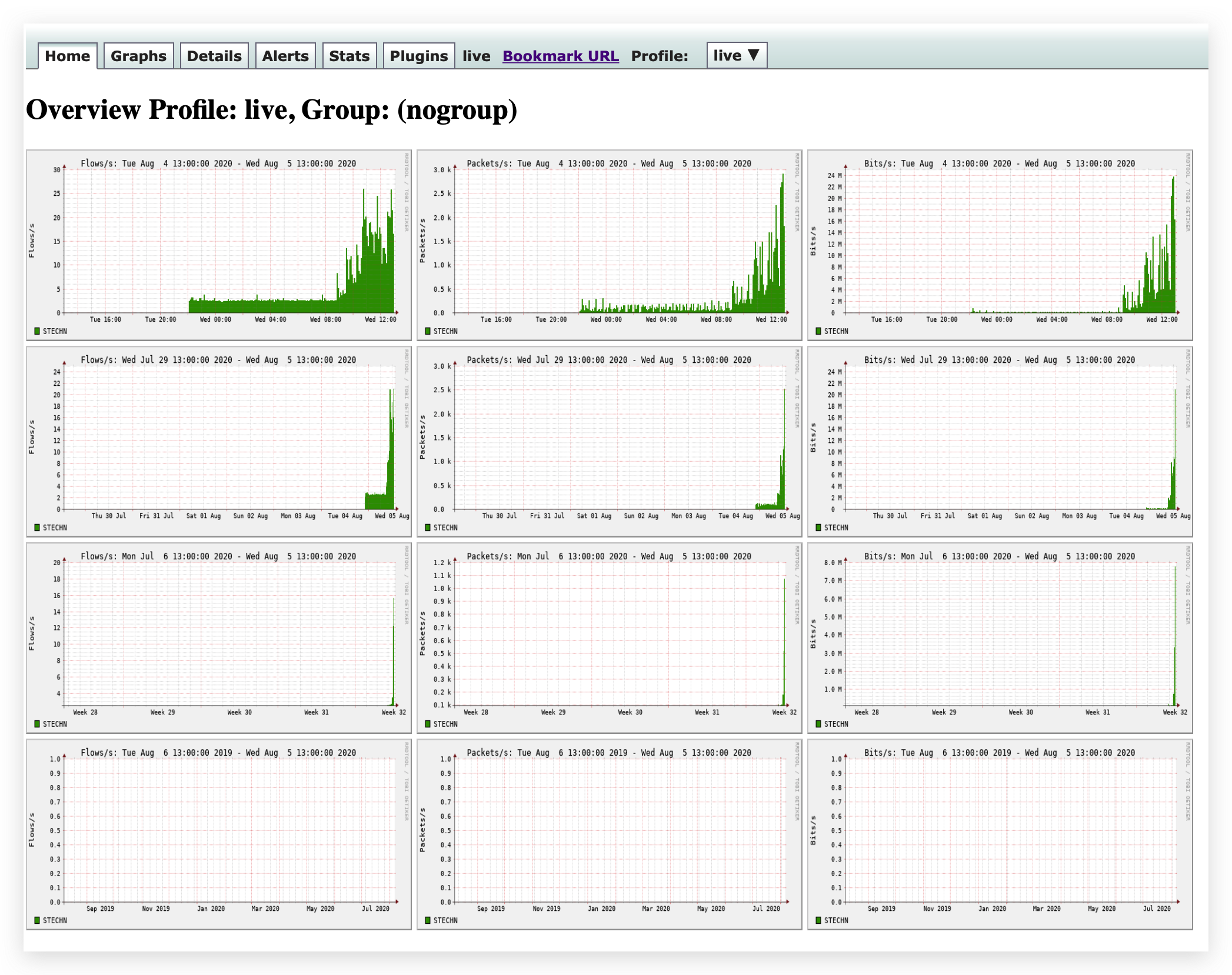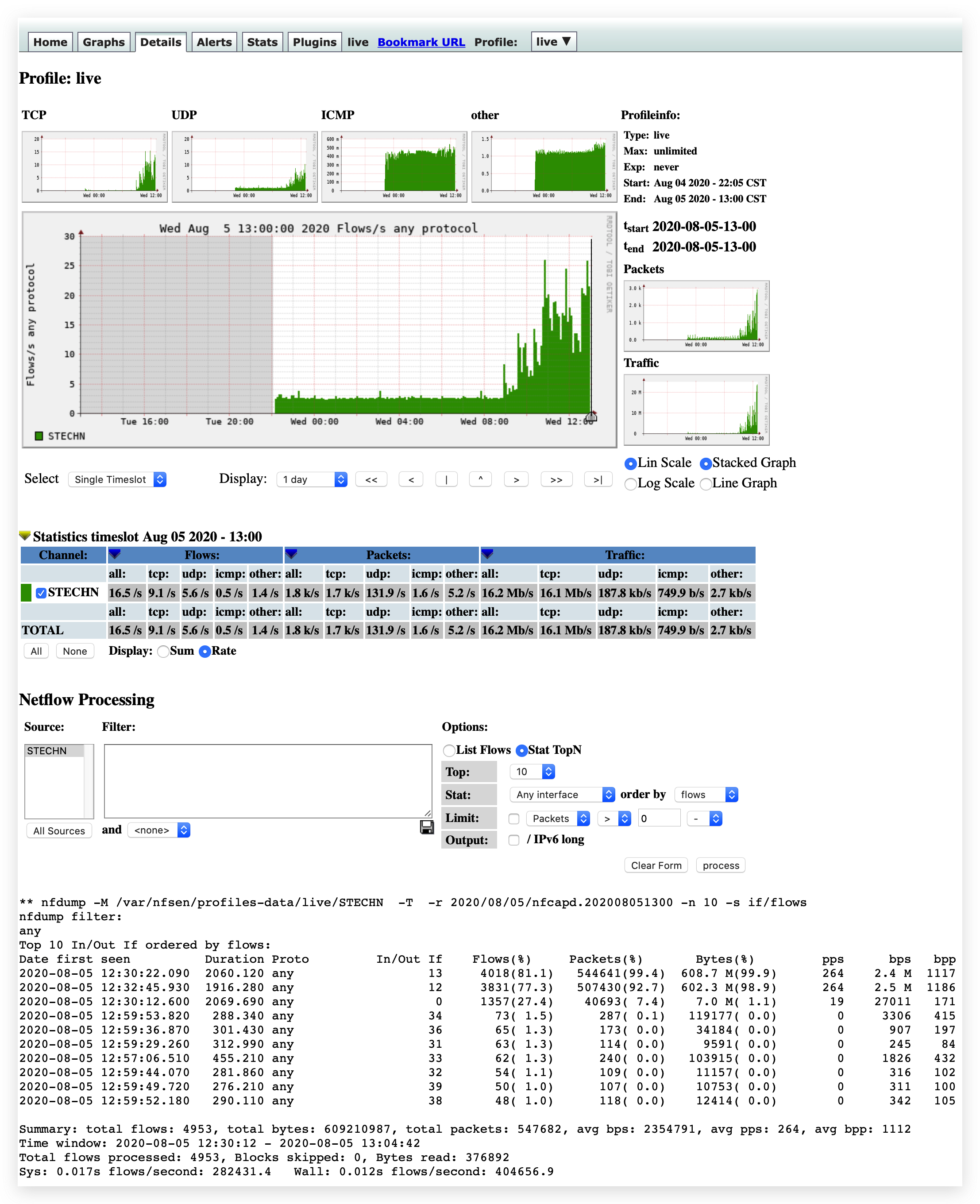 #更新 sudo apt-get update & upgrade -y #安装相关组件 sudo apt-get install nfdump php7.3 rrdtool librrdtool-oo-perl libmailtools-perl libsocket-perl libsocket6-perl #从sourceforge下载nfsen,当前版本1.3.8 #https://sourceforge.net/projects/nfsen/ #解压到~/nfsen目录 #修改~/nfsen/etc/下的nfsen-dist.conf并另存为nfsen.conf