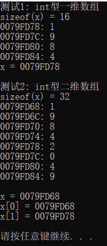 // 输出二维数组名x, 以及,x[0], x[1]的值