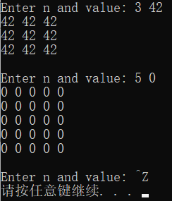 while(printf("Enter n and value: "), scanf("%d%d", &n, &value) != EOF) {