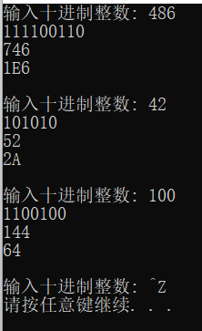while(printf("输入十进制整数: "), scanf("%d", &x) != EOF) {