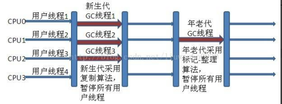 - 年轻代回收: 并行复制采用复制算法,并行收集,会StopTheWorld.