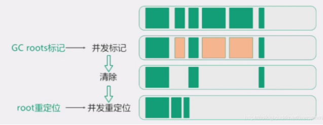 roots重定位:是对存活的对象进行移动,以腾出大块内存空间,减少碎片产生。重定位最开始会StopTheWorld,却决于重定位集与对象总活动集的比例,并发重定位与并发标记类似。