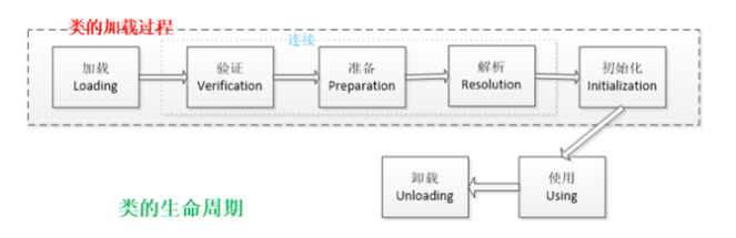 类的生命周期包括这几个部分,加载、连接、初始化、使用和卸载,其中前三部分是类的加载过程,如下图: