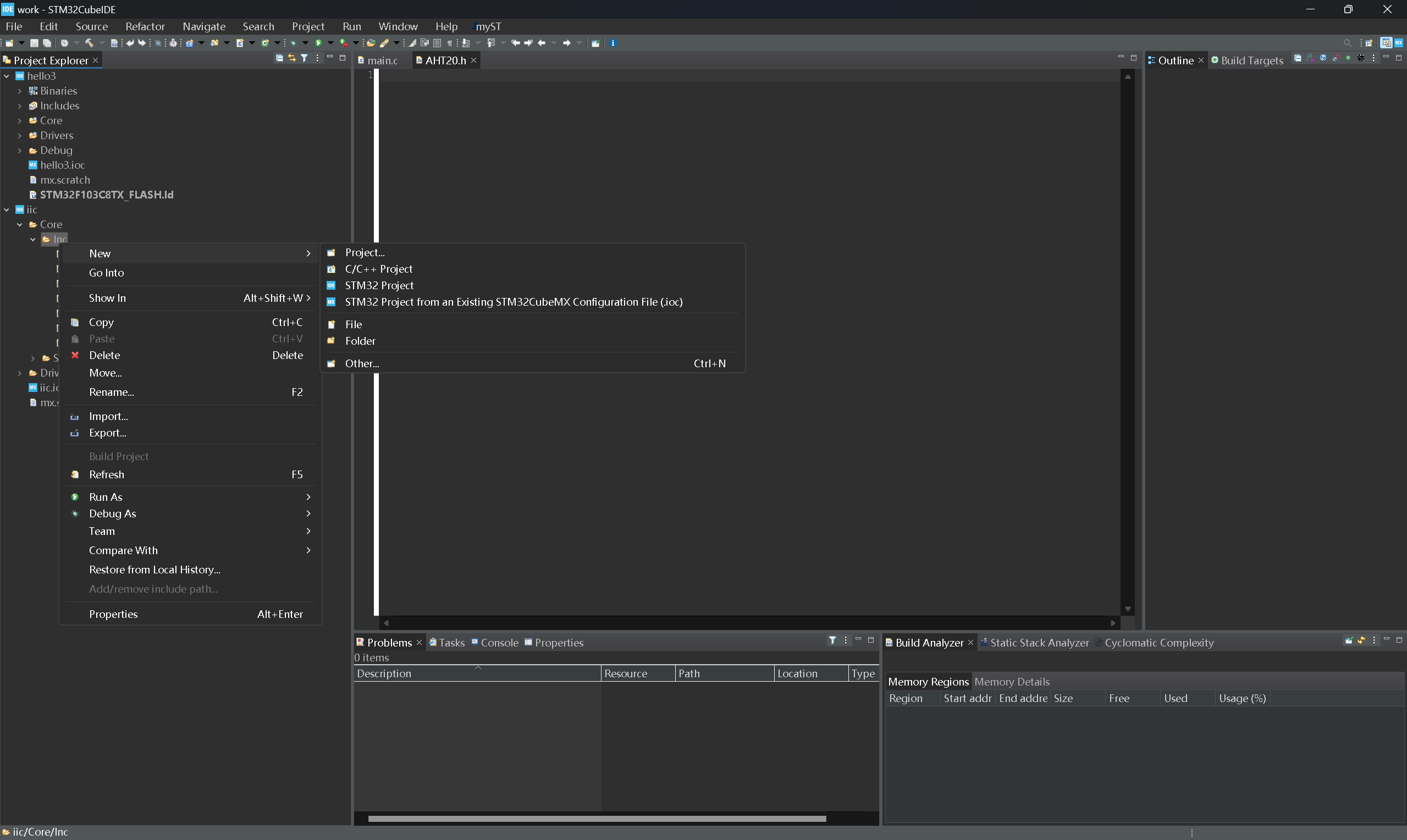 昨天感觉cubeide有一些bug,具体表现为在外设的.c文件明明识别到了某个函数但是又打不开定义,于是在软件内更新了一下cubeide,结果更新完软件打不开了,没办法只能重装。重装完后新建工程的时候提示无法生成代码,因为缺少固件包,但打开固件界面又有固件包,如果无视提示强行生成的话是能生成的,但新建的工程会显示缺少显式编码之类的,并且右键文件夹新建文件的时候没有“header file”选项和其他选项,像下面一样